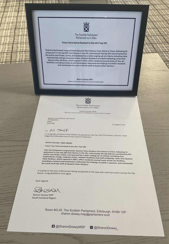 The recognition underscores Queen View Harbour’s growing reputation across Scotland and the UK, serving as a model of excellence in the care sector.
